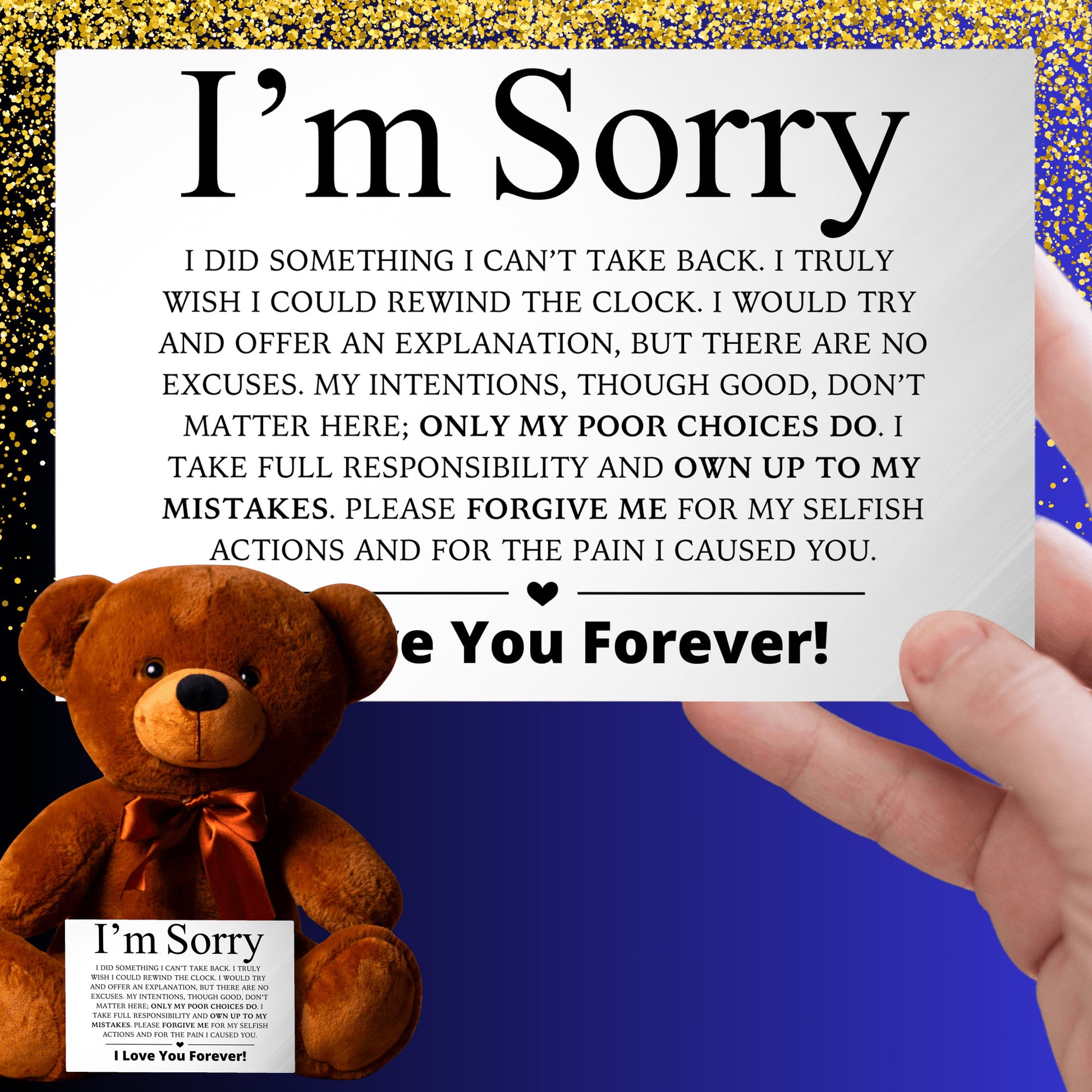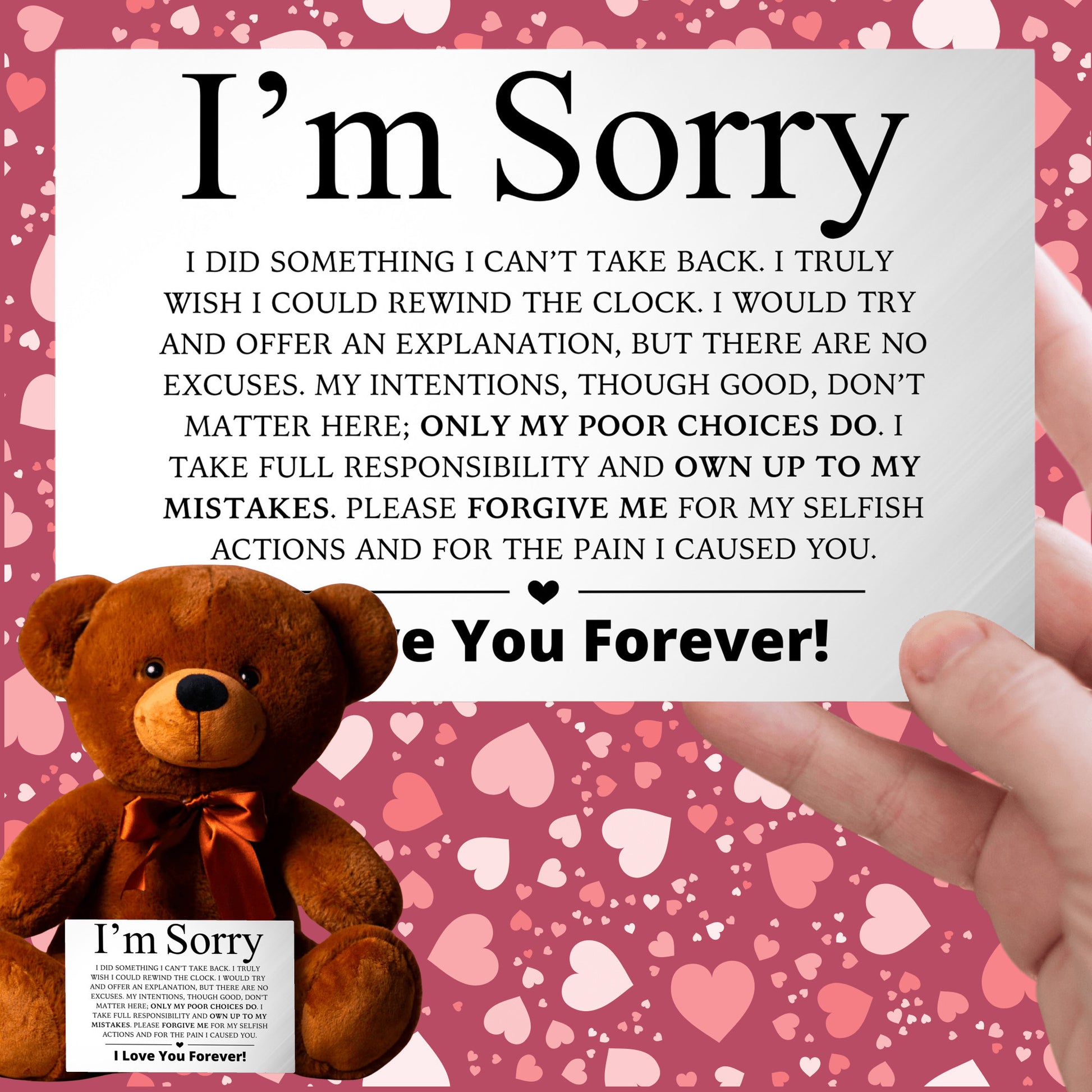 It comes holding a canvas message card—professionally printed on durable artist-grade canvas and mounted on a solid board—featuring a deeply emotional apology message. It's not just a card... it's your second chance in writing.